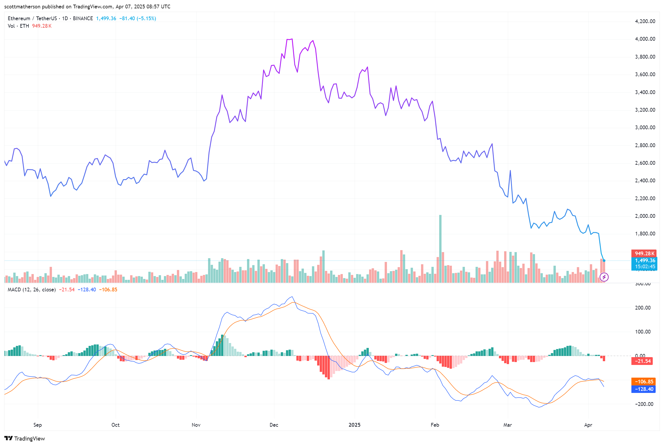 !EthereumETH 在一维图表上的交易价格为 1,497 美元 |资料来源:ETHUSDT on Tradingview.com