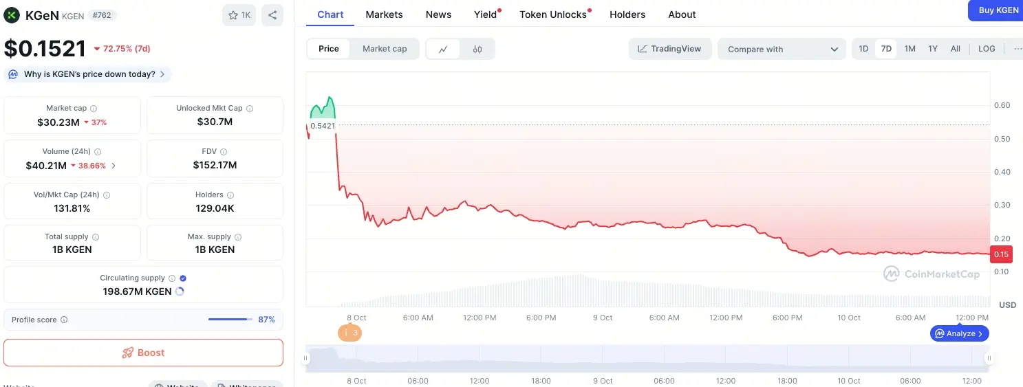 KGEN إصدار العملة首日 big dump:من 0.636 دولار إلى 0.1520 دولار
