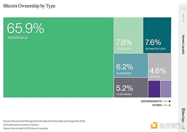 الواقع هو: معظم البيتكوين في حالة غير سائلة، ويتم الاحتفاظ بها لفترة طويلة. فقط حوالي 14.5% من عرض البيتكوين مخزن في بورصات مثل Coinbase أو Binance والتي تتمتع بسيولة نسبية، بينما تخزن الأصول المتبقية في محافظ خارج السلسلة في حالة غير سائلة.