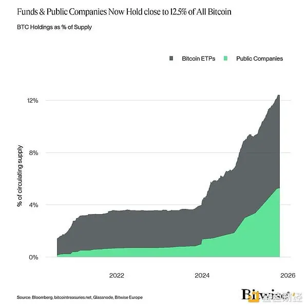 خلال هذه العملية، مع امتلاك صناديق الاستثمار المتداولة (ETFs) للأصول لصالح ملايين المستثمرين الأفراد، سيتوسع نطاق انتشار البيتكوين. كما تظهر التقارير المالية للشركات المدرجة أنها تُمتلك من قبل مئات الآلاف من المستثمرين المختلفين. حتى وقت كتابة هذه المقالة، تسيطر المؤسسات الاستثمارية (ETPs والشركات المدرجة) على حوالي 12.5% من إجمالي إمدادات البيتكوين - ولا تزال في ارتفاع سريع.