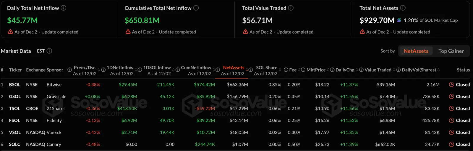 تم إدراج أولى منتجات SOL في 28 أكتوبر، ورغم انخفاض سعر SOL بنحو 31% منذ الإدراج، إلا أن التدفقات المالية أظهرت تدفقًا معاكسًا حيث ازدادت الشراء مع الهبوط. حتى 2 ديسمبر، بلغ صافي التدفقات التراكمية في قطاع صناديق SOL ETF نحو 618 مليون دولار، بإجمالي أصول بلغ 915 مليون دولار، وهو ما يمثل 1.15% من القيمة السوقية الإجمالية لـ SOL. تحقيق هذا الحجم في أقل من شهرين يعكس إلى حد كبير الاعتراف الواسع من السوق بمكانة SOL كـ"ثالث أكبر بلوكشين عام".