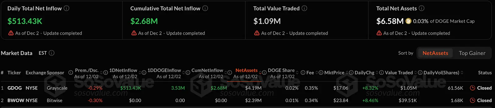 واجهت صناديق DOGE ETF فتوراً كبيراً في السوق، مما أكد وجود فجوة ضخمة بين عملات الميم وقنوات رؤوس الأموال المؤسساتية. كان أداء منتجات مثل GDOG من Grayscale (المدرج في 24 نوفمبر) ضعيفًا للغاية، حيث بلغ صافي التدفقات التراكمية 2.68 مليون دولار فقط، وإجمالي الأصول المدارة أقل من 7 ملايين دولار، أي 0.03% فقط من القيمة السوقية لدوج. والأسوأ من ذلك أن منتج Bitwise المماثل شهد تدفقات صفرية، فضلاً عن ضعف حجم التداول اليومي (نحو 1.09 مليون دولار)، مما يشير إلى أن المستثمرين التقليديين ما زالوا متشككين تجاه أصول MEME التي تفتقر للدعائم الأساسية وتعتمد بالأساس على مشاعر المجتمع.