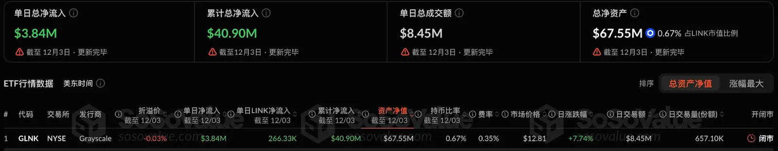 تم إدراج صندوق GLINK من Grayscale رسميًا في 3 ديسمبر، وحصد في يومه الأول تدفقات بلغت نحو 40.9 مليون دولار، وبقيمة أصول حالية تبلغ 67.55 مليون دولار وهو ما يمثل 0.67% من القيمة السوقية لـ LINK. وتُظهر نتائج التداول في اليوم الأول أن GLINK حقق بداية جيدة من حيث السيولة وجذب رؤوس الأموال.