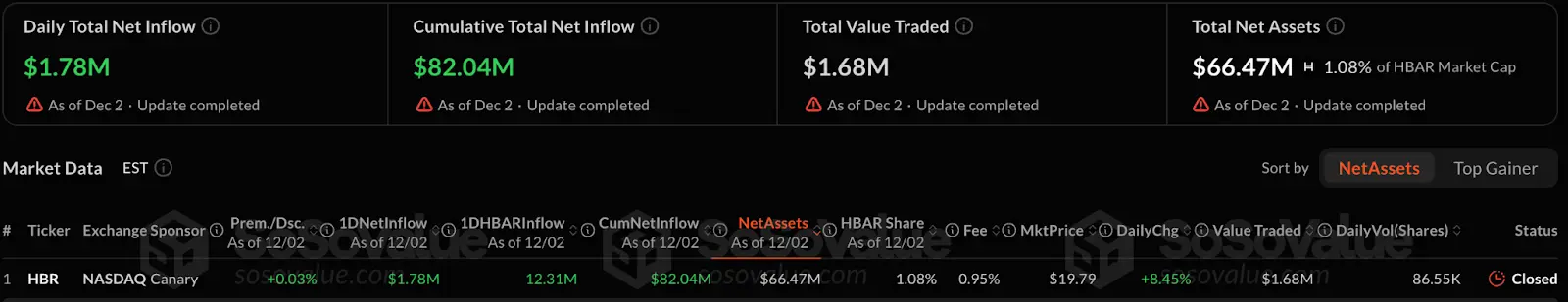 نجح صندوق HBAR ETF، كممثل عن المشاريع ذات القيمة السوقية المتوسطة والصغيرة، في تحقيق اختراق نسبي يفوق حجمه. تم إدراجه في 29 أكتوبر، ورغم انخفاض سعر HBAR بنحو 28% خلال شهرين، إلا أن الصندوق اجتذب تدفقات صافية بلغت 82.04 مليون دولار. وبلغت قيمة الأصول المدارة لصندوق HBAR ETF ما يعادل 1.08% من إجمالي القيمة السوقية لـ HBAR. ويعد هذا الاختراق أعلى بكثير من صناديق Doge وLTC وغيرها، مما قد يشير إلى ثقة السوق في أصول متوسطة القيمة ذات تطبيقات مؤسسية واضحة مثل HBAR.
