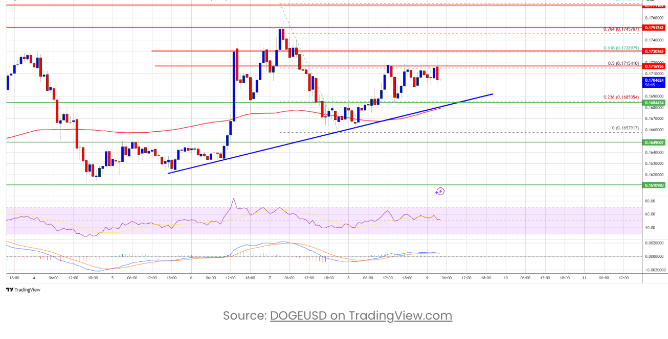◆ DOGEが新たな上昇市場を開始 DOGEの価格はビットコインとイーサリアムの動きに追随し、0.1650ドルのサポートゾーンから反発に成功しました。DOGE/USDは0.1665ドルと0.1680ドルの二つの重要なレジスタンスを強力に突破しました。ブルはさらに力を入れ、価格を0.170ドル以上に押し上げ、一時0.1722ドルの高値から0.1657ドルの安値まで下落の50%フィボナッチリトレースメントに達しました。
