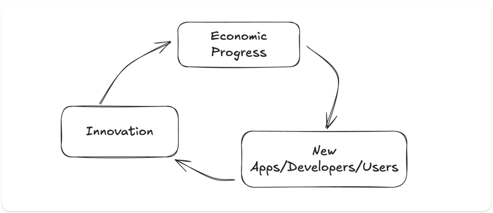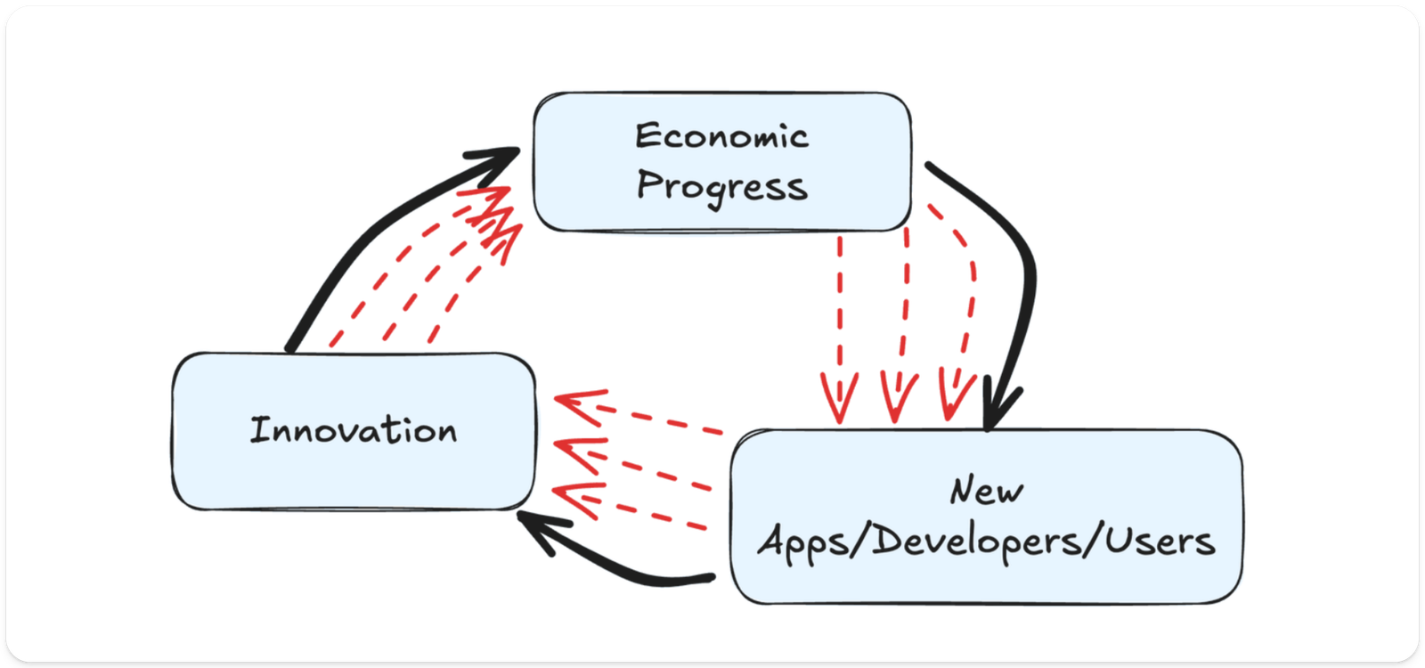 革新、インフラおよびアプリケーションの改善は、効率を向上させ、新しいユースケースやアーキテクチャを探求するために重要です。革新の段階では、協力が特に重要ですが、この段階では自然なインセンティブメカニズムによってチームが分散することがよくあります。革新は経済の進歩を推進し、サイクルが再び始まります。
