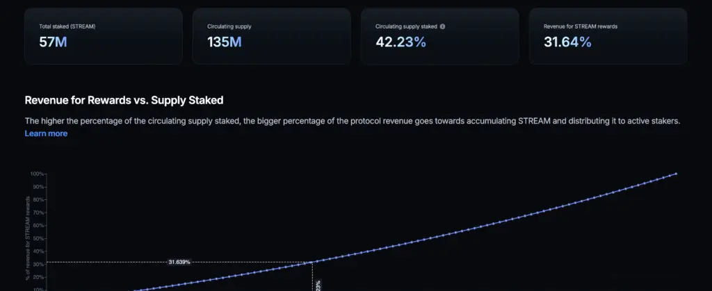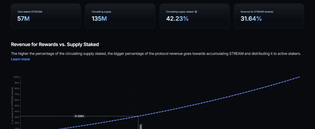 プロトコル収益の買い戻しに使用される割合は、ステークされたトークンの割合と直接相関しています:合計でより多くの$STREAM がステークされるにつれて、プロトコル収益のより大きな割合が$STREAM の買い戻しと報酬分配に向けられます。これらの数値がどのようにスケールするかの予測は、ステーキングダッシュボードで詳細に探ることもできます。