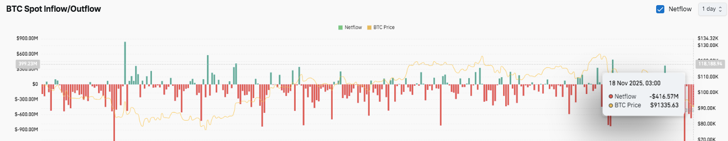 スポットフローは似たようなストーリーを語っています。流出が引き続き支配しており、持続的な売りを示す大きな赤い印が頻繁に見られます。11月18日に発生した$416.57百万の最新の注目すべき流出は、$91,335付近の価格の弱さと一致しています。