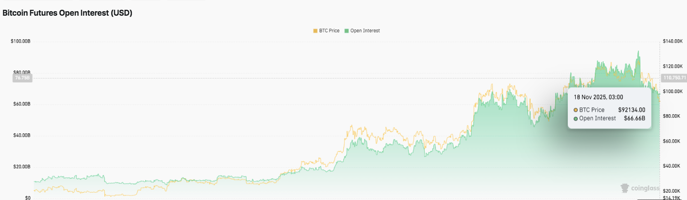 ビットコインの先物オープンインタレストは、価格が92,134ドル近くで推移する中、666.6億ドルに緩和されました。$80 億ドル以上の水準からの最近の下落は、トレーダーが調整中にレバレッジをかけたエクスポージャーを減少させていることを示しています。