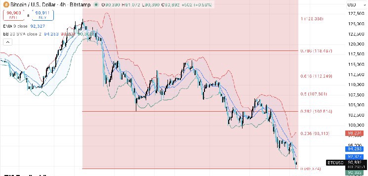 ビットコインは$89,374付近の0%フィボナッチリトレースメントエリアを維持しようとしています。このレベルは最近の下落からの最後の主要なサポートを示しています。このゾーンを下回る持続的なクローズは、さらなる損失の扉を開くことになります。