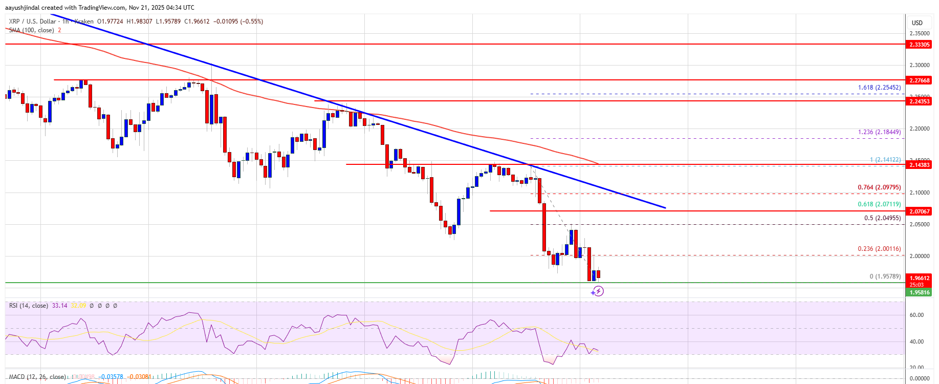 XRP価格が下落を続け、より柔らかいセンチメントの中で$2.0を下回る動きを深める
