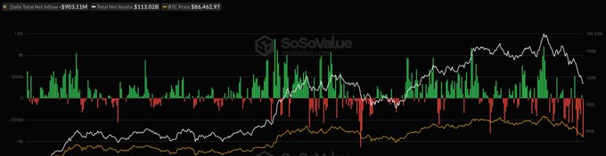 米国現物ビットコインETFは11月20日に$903 百万ドルの純流出を記録し、ETF史上2番目に大きな流出日となった後、売り圧力はさらに強まりました。