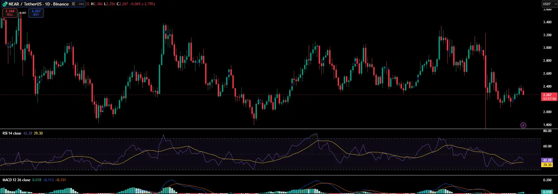 At the time of writing, NEAR Protocol (NEAR) is trading near $2.26, down roughly 2.8% in the past 24 hours. The token remains under short-term pressure following a rejection near $2.40, with indicators showing limited buying momentum.