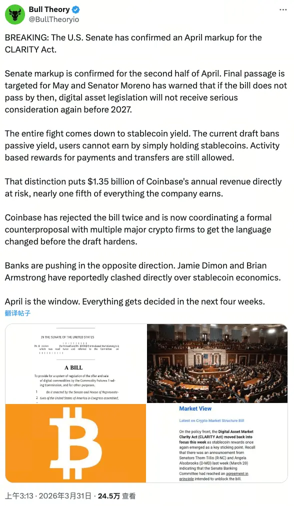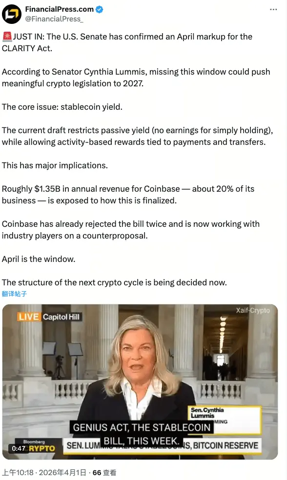 In April 2026, the long-running standoff on digital-asset regulation in the U.S. Capitol is moving toward a critical inflection point. The Senate Banking Committee plans to conduct a committee review of the “Digital Asset Markets CLARITY Act” in mid-April (after the Easter recess ends). Based on recent remarks by multiple lawmakers, the final legislative text is expected to be released within the next few days.