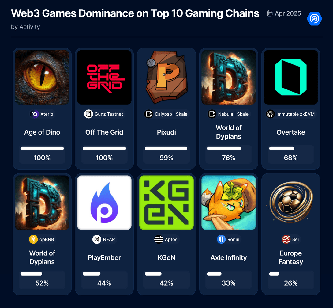 A posição dominante dos jogos-chave no nível da blockchain ainda é muito alta: Pixudi detém 99% do Calypso, Off The Grid tem uma participação de 100% no GUNZ, e World of Dypians ocupa 76% do Nebula.