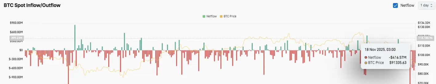 Os fluxos à vista contam uma história semelhante. As saídas continuam a dominar, com frequentes grandes impressões vermelhas a mostrar vendas persistentes. A mais recente saída notável de $416,57 milhões a 18 de novembro alinhou-se com a fraqueza dos preços perto de $91.335.