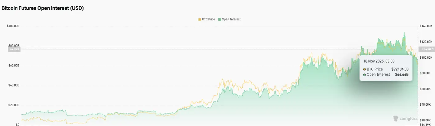 O interesse em aberto dos futuros de Bitcoin caiu para $66.66 bilhões, enquanto o preço flutuava perto de $92,134. O recente declínio a partir de níveis acima de $80 bilhões mostra que os traders estão reduzindo a exposição alavancada durante a correção.