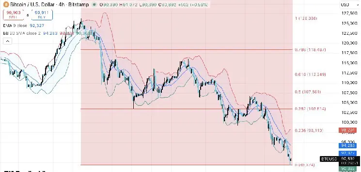 O Bitcoin está a tentar manter a área de retração de Fibonacci de 0% perto de $89,374. Este nível marca o último suporte importante da recente queda. Qualquer fechamento sustentado abaixo desta zona abre a porta a perdas mais profundas.