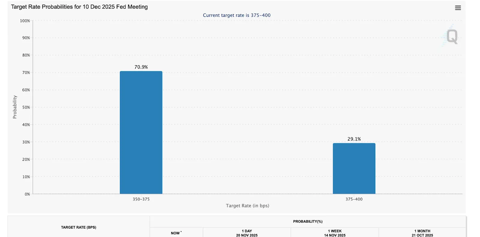 Após o relatório de emprego, os mercados de futuros reduziram a probabilidade de um corte em janeiro de 2026 de 55% para 20%. Para dezembro, os dados da CME mostram uma probabilidade de 70% de um corte, acima dos 39% de ontem.