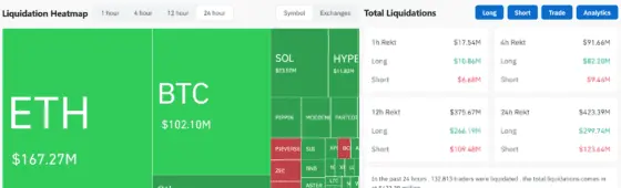 De acordo com a Coinglass ((Coinglass)), o volume total de liquidações nas últimas 24 horas atingiu 424,67 milhões de dólares, com 132.628 traders a serem forçados a encerrar as suas posições.