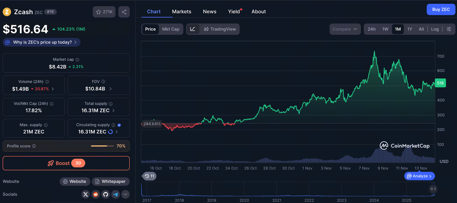 Источник: https://coinmarketcap.com/currencies/zcash/