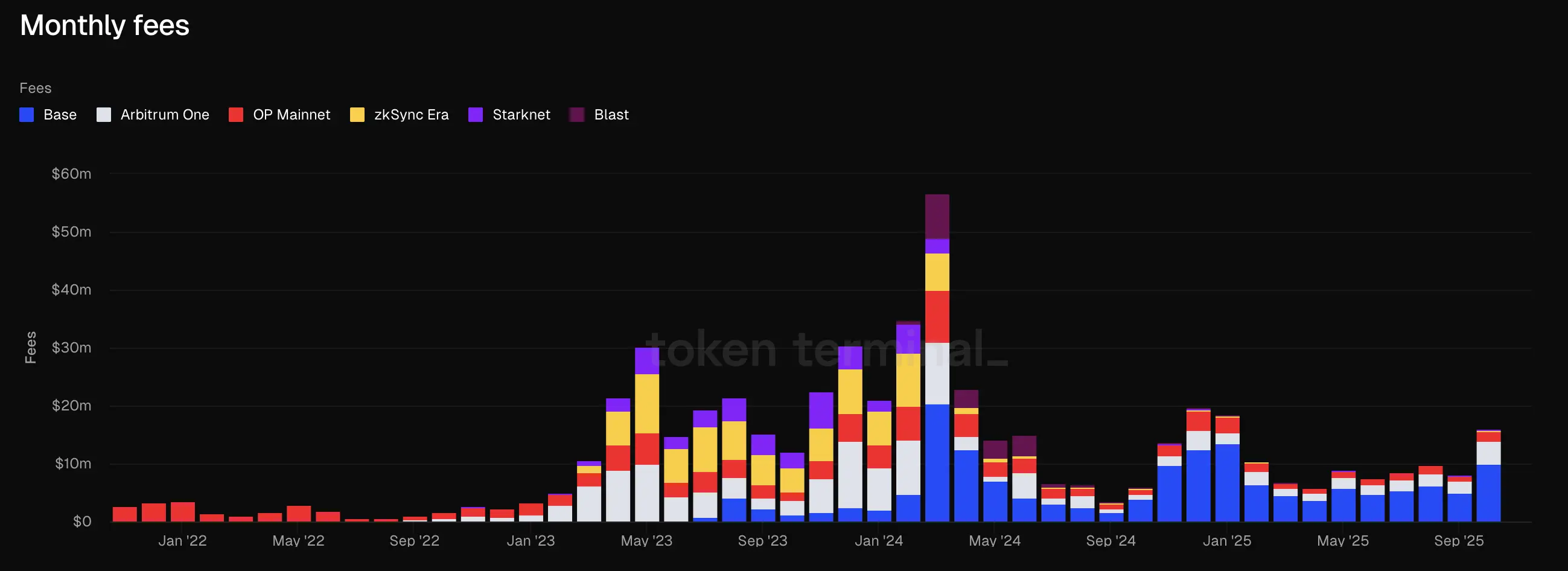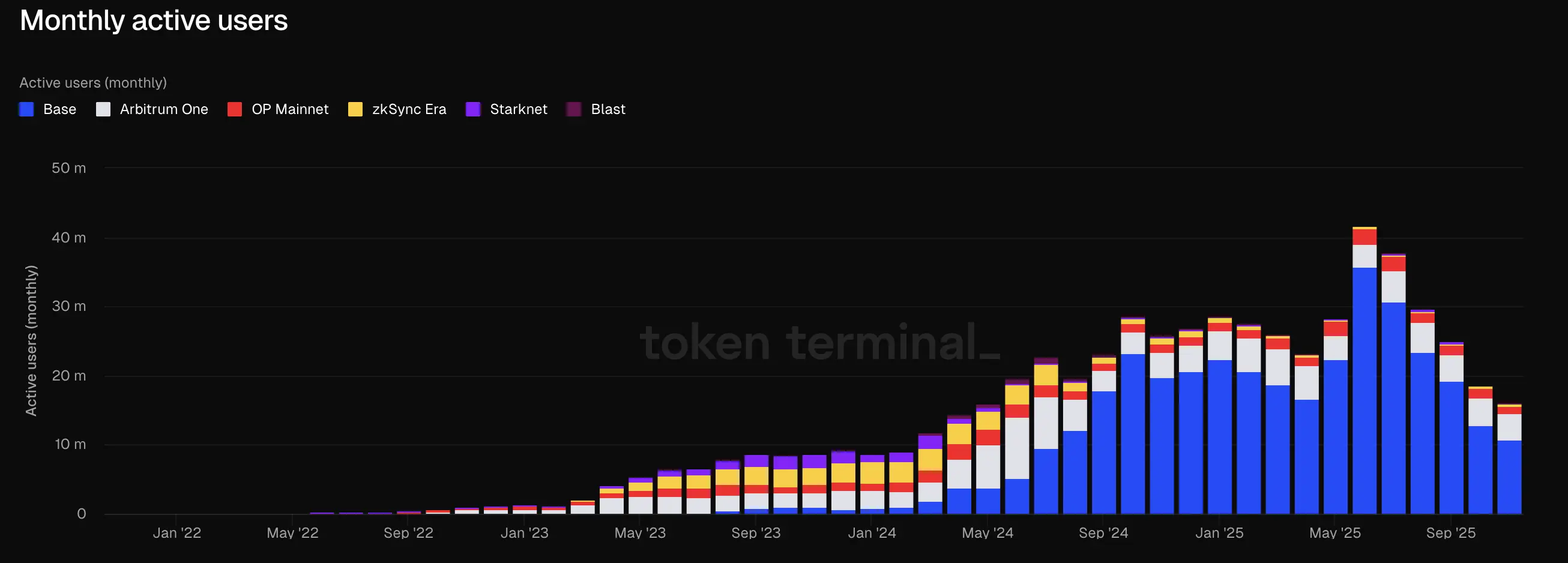 По данным о месячных активных пользователях, в октябре L2 сети показали тенденцию к снижению и усилению дифференциации. По данным Token Terminal, месячная активность пользователей L2 составила 16,1 млн, что на 61,4% ниже исторического максимума в июне (41,7 млн), но значительно выше основной сети Эфир (8,3 млн). Base сохраняет абсолютное лидерство — 67,1%, но темпы роста пользователей заметно снизились; Arbitrum One — 22,9%, стабильная динамика; zkSync Era, Starknet и Blast также потеряли значительную часть пользователей по сравнению с историческими максимумами.