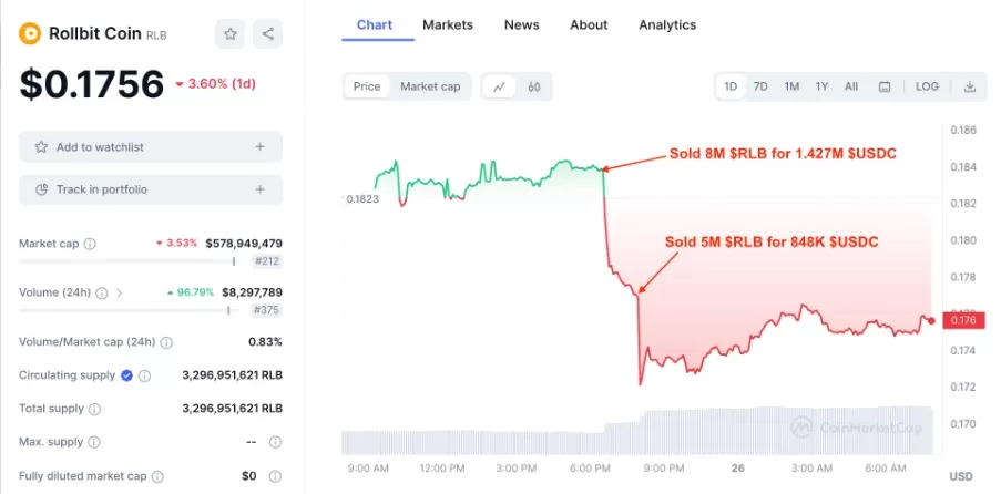 Söz konusu balina geçtiğimiz iki hafta boyunca toplam 30.4 milyon RLB’yi 5.536 milyon USDC karşılığında, RLB başına ortalama 0.182 dolar fiyatla elden çıkardı. Satılan RLB tokenleri resmi Rollbit sıcak cüzdanlarından çekilmişti.