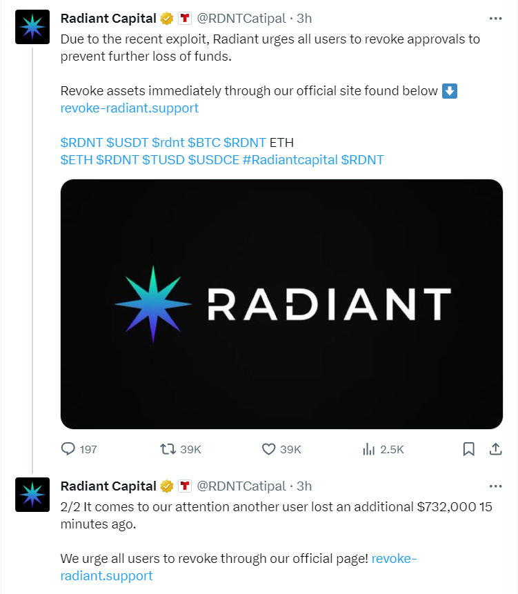 Radiant, o zamandan beri Arbitrum’daki borç verme ve borç verme piyasalarını duraklattı ve yatırımcılara şu anda hiçbir ek fonun risk altında olmadığı konusunda güvence verdi. Ayrıntılı bir otopsi sözü verdi ve soruşturma tamamlandıktan sonra normal operasyonlara geri dönme sözü verdi. Radiant, “Bir hatırlatma olarak, Arbitrum’daki piyasaların duraklatılması kaldırılıncaya kadar hiçbir işlem yapılamaz” diye ekledi. Bu arada kripto para topluluğu, kullanıcıların onayları iptal etmesine yardımcı olduğu iddia edilen kimlik avı bağlantıları yayınlayan sahte Radiant Capital hesaplarıyla çoktan doldu.