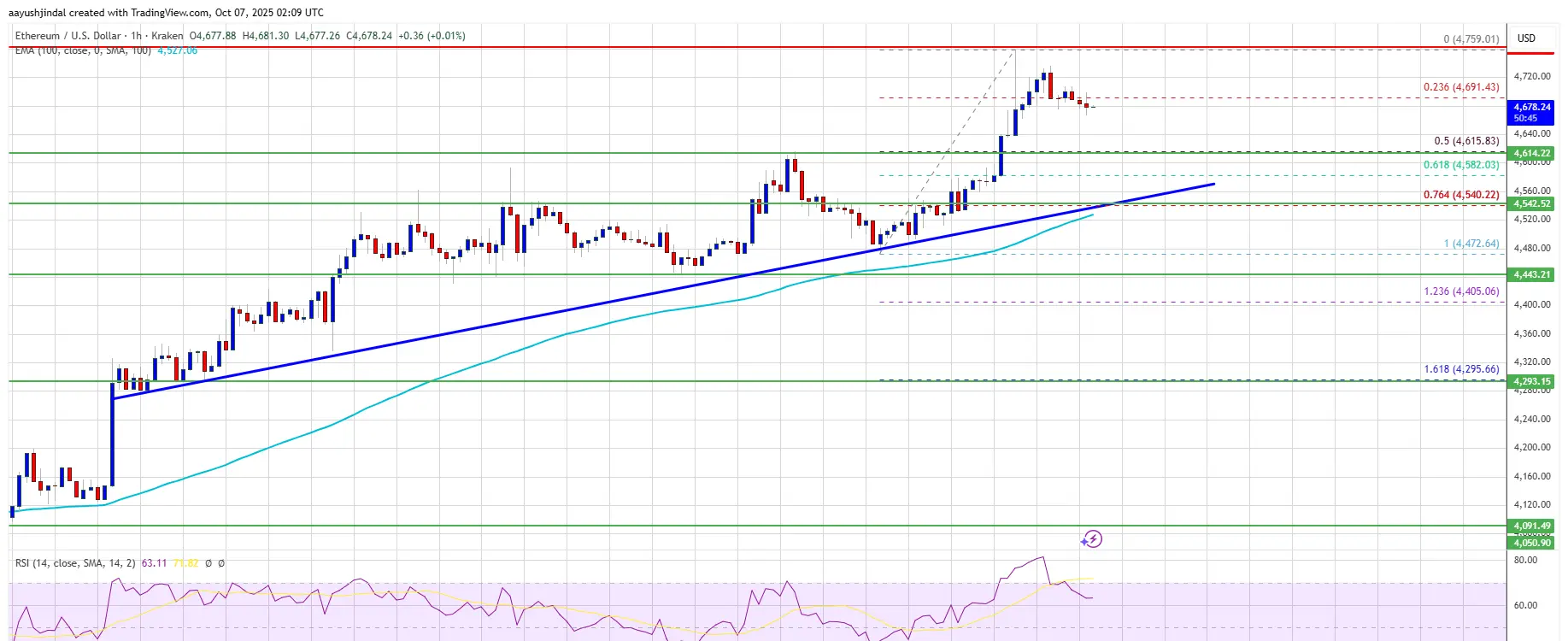 Ціна Ethereum почала стабільне зростання вище $4,650. ETH наразі консолідується і може прагнути до більших прибутків, якщо подолає спротив на рівні $4,750.