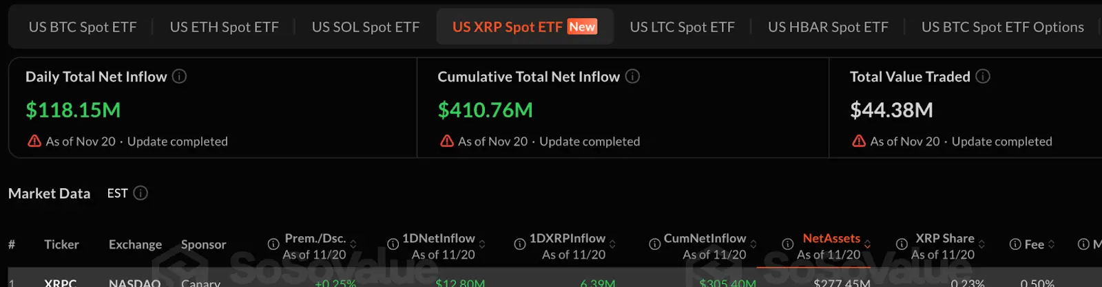 Quỹ đã ghi nhận dòng tiền ròng 292,6 triệu USD kể từ ngày 13 tháng 11 mà không có ngày nào bị rút vốn. Một ETF XRP khác cũng gia nhập xu hướng với $105 triệu USD dòng tiền ròng.