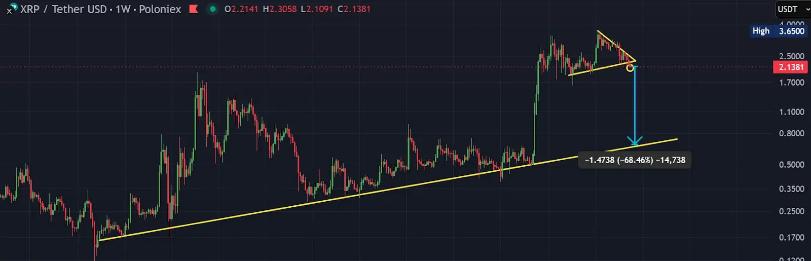 Tuy nhiên, một số chuyên gia cảnh báo về nguy cơ cấu trúc nghiêm trọng hơn. Nhà quan sát thị trường Block Bull lưu ý rằng XRP đã phá vỡ mô hình tam giác cân nhiều tháng trên biểu đồ tuần.