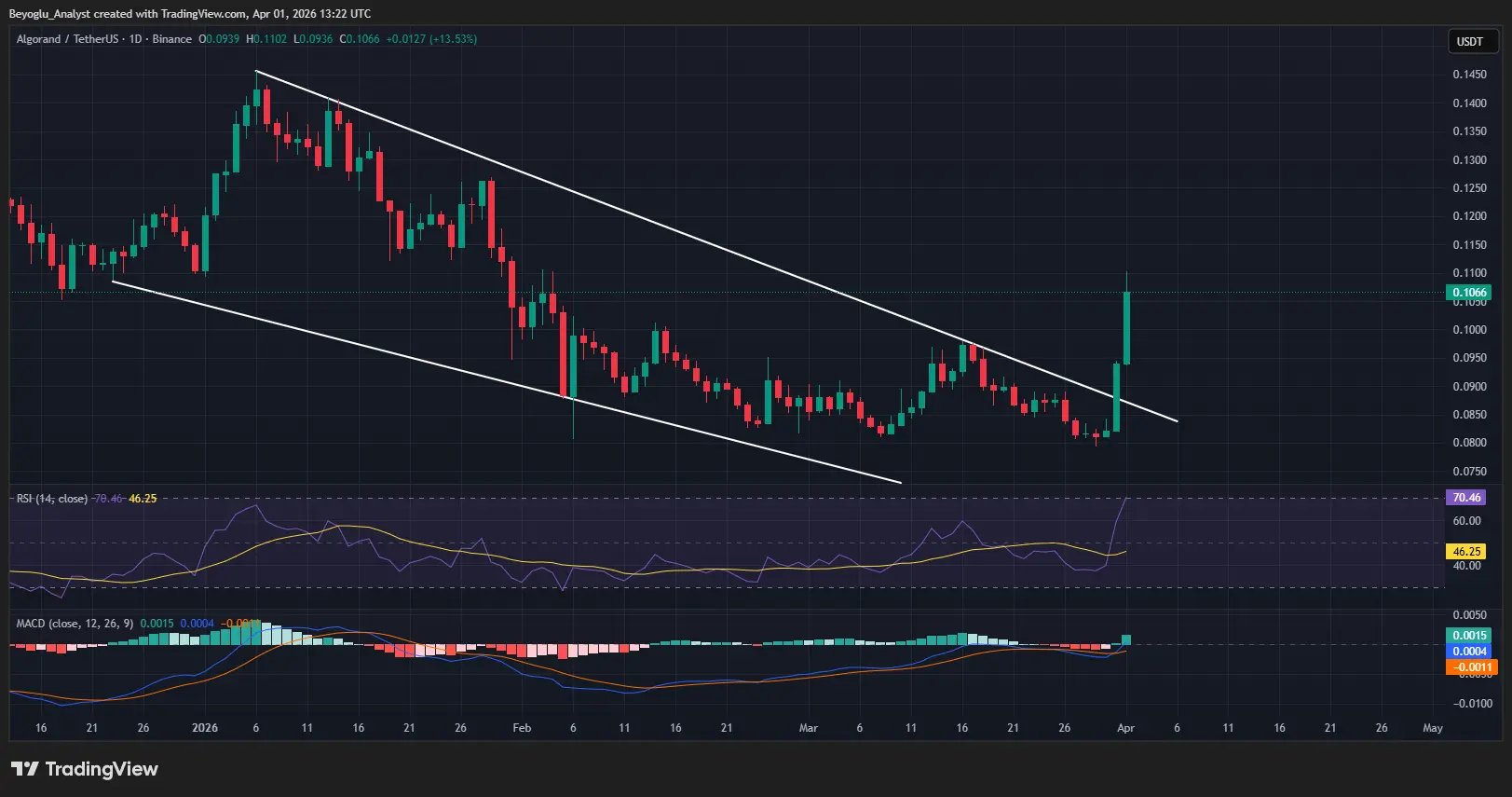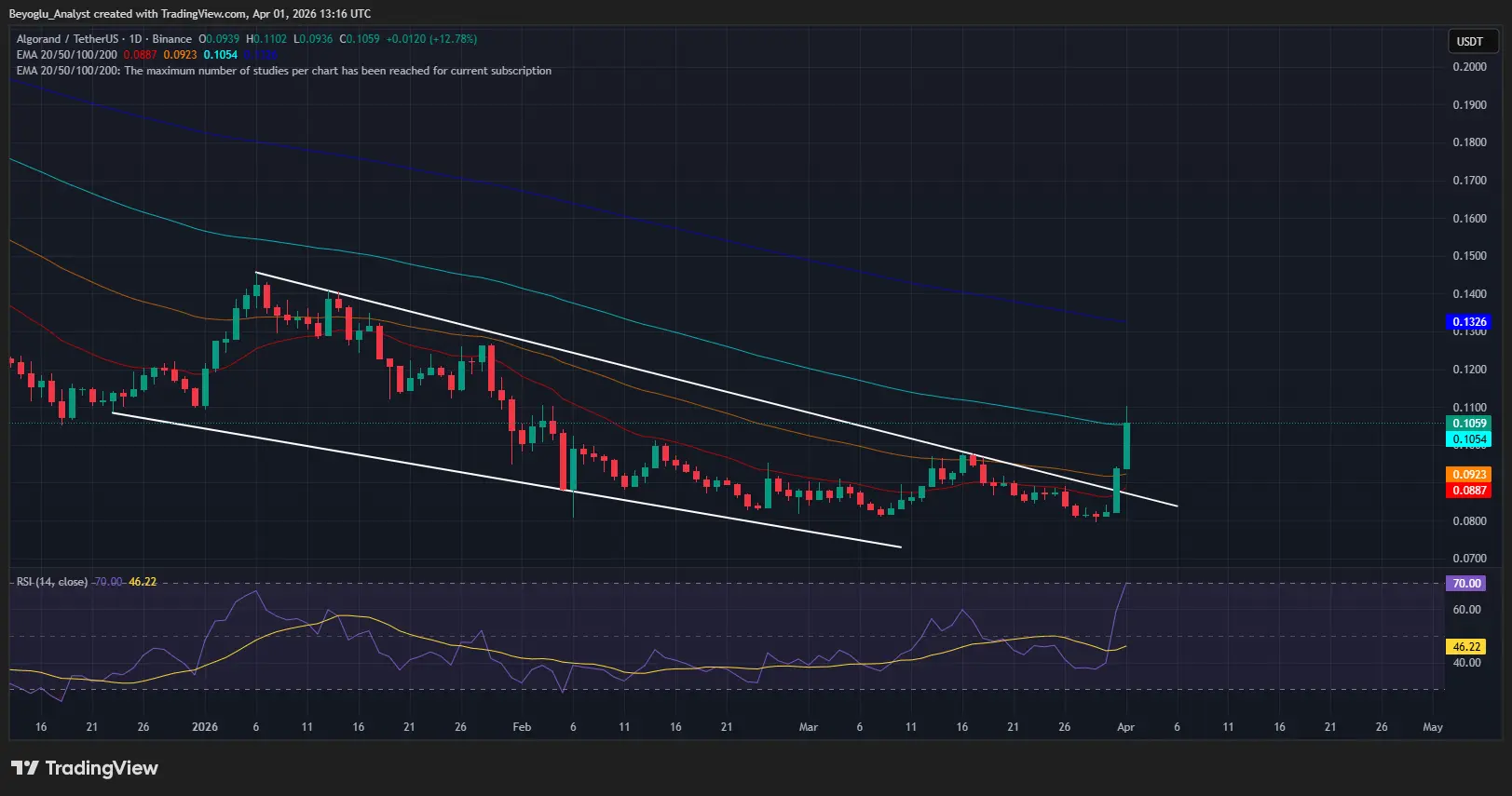 Giá của ALGO đã vượt lên trên các đường EMA 20, 50 và 100. Trên khung thời gian theo ngày, ALGO đã bứt phá khỏi kênh giảm dần, cho thấy hiện tại đà tăng ngắn hạn; các mức giá mục tiêu là 0.138 và EMA 200.
