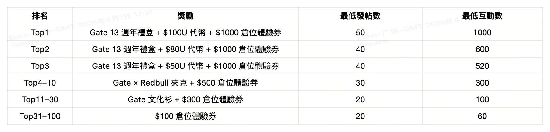 4. 實體週邊獎勵將於活動結束後 14 個工作日內透過電子郵件及站內信通知得獎者。請於收到通知後 30 日內前往 Gate 週邊商城 填寫寄送資訊。逾期未填、資訊錯誤或無人簽收等情況,將視為自動放棄獎勵;寄送資訊提交後無法修改,請務必確認正確無誤。獎勵將於成功提交寄送資訊後 60 日內完成發放。如遇物流异常或奖品缺货等情况,實物獎勵將按以下標準轉換為倉位體驗券發放:Gate 13 週年禮盒:$1,000 倉位體驗券、Gate × Red Bull 聯名夾克:$300 倉位體驗券、Gate 文化衫:$100 倉位體驗券。