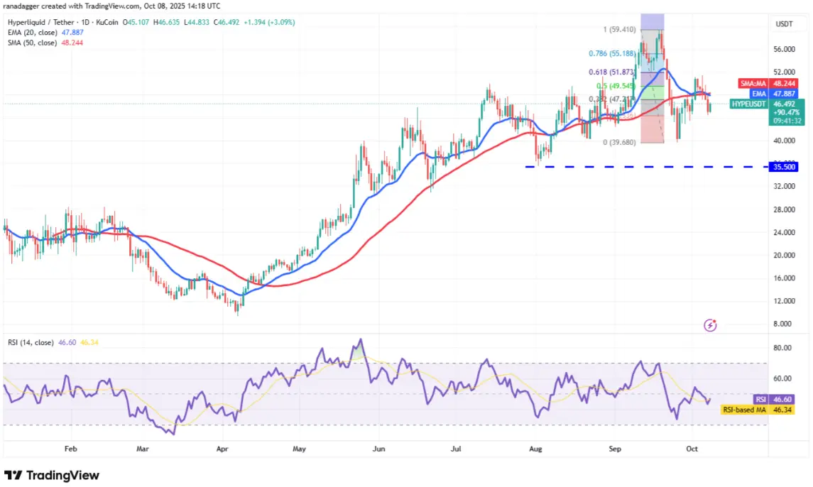Hyperliquid (HYPE)已經從61.8%的Fibonacci回撤位51.87 USD反轉下跌,顯示出空頭在價格漲時正在獲利了結。