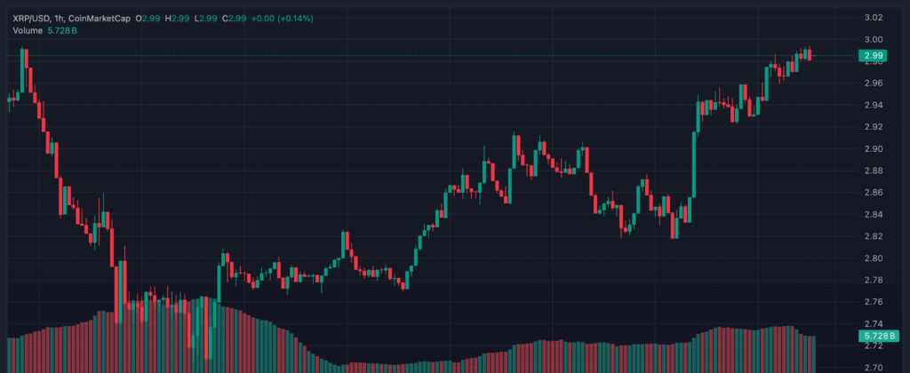 今日XRP價格爲$2.98;該代幣需要大約68%的漲才能達到$5。最近的XRP新聞顯示出穩定的看漲積累。該代幣最近突破了$3.00--$3.05的阻力區間,並且交易價格高於主要移動平均線。